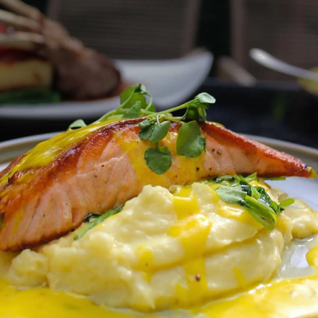Maris Piper mash potato, spinach, creamy saffron sauce
