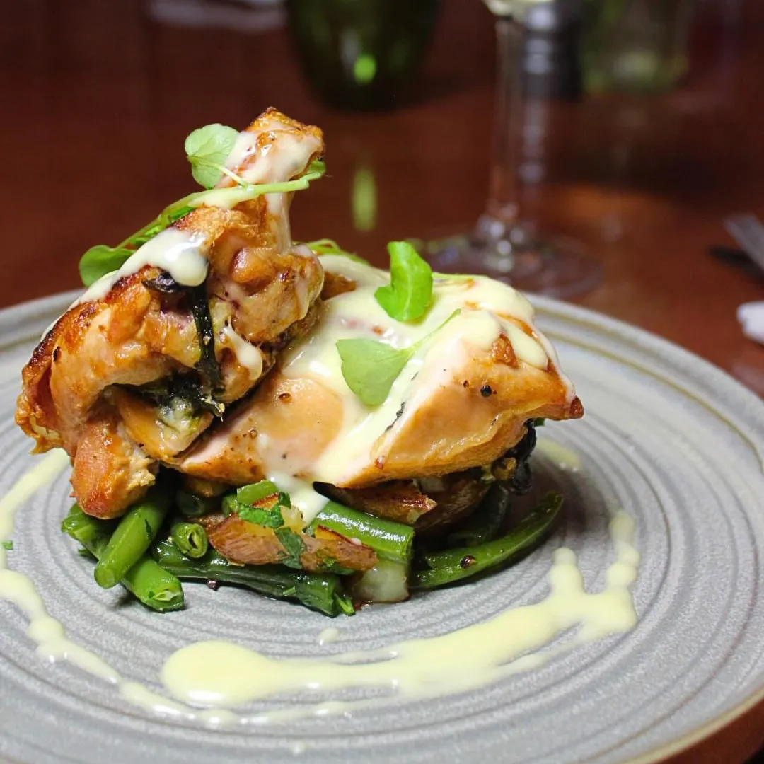Goats cheese & spinach stuffed chicken breast, new potatoes,